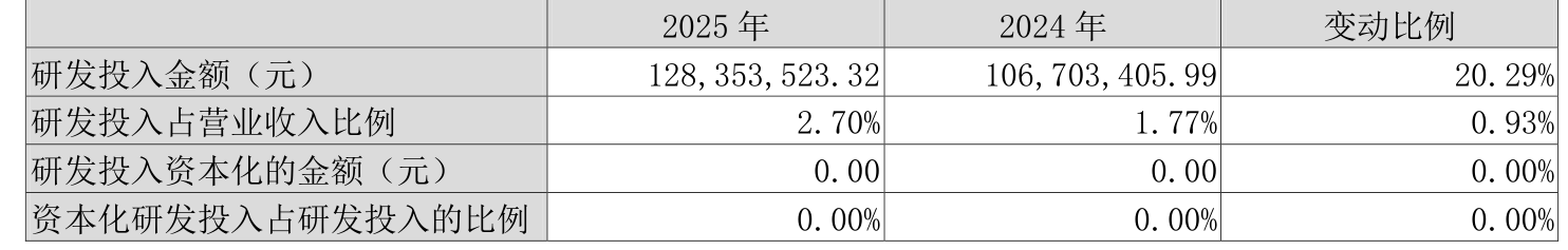 2025年全年,公司研发投入金额为1.28亿元,同比增长20.29%;研发投入占营业收入比例为2.7%,相比上年同期上升0.93个百分点。此外,公司全年研发投入资本化率为0%。