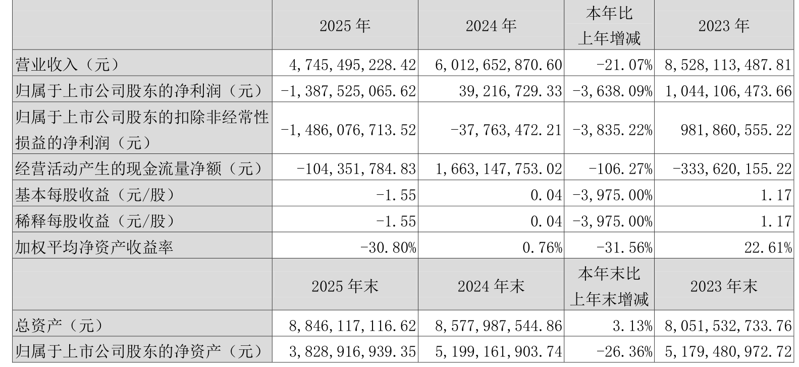 中证智能财讯山东海化(000822)3月21日披露2025年年度报告。2025年,公司实现营业总收入47.45亿元,同比下降21.07%;归母净利润亏损13.88亿元,上年同期盈利3921.67万元;扣非净利润亏损14.86亿元,上年同期亏损3776.35万元;经营活动产生的现金流量净额为-1.04亿元,上年同期为16.63亿元;报告期内,山东海化基本每股收益为-1.55元,加权平均净资产收益率为-30.80%。