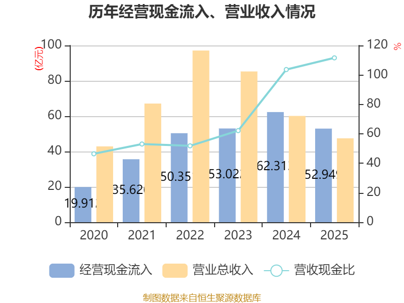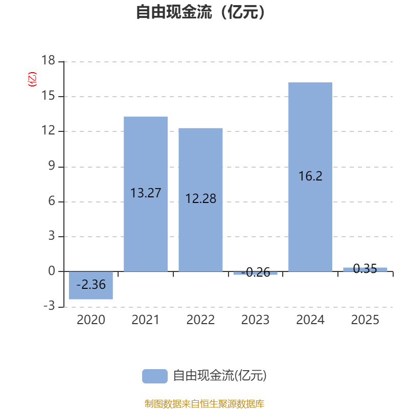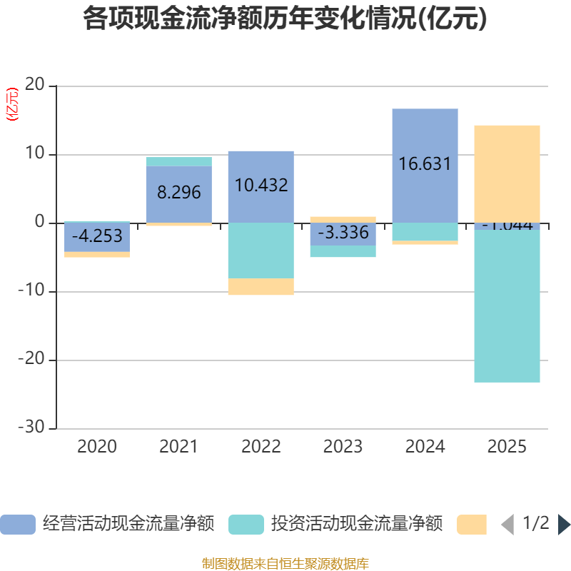截至2025年,公司经营活动现金流净额为-1.04亿元,同比减少17.67亿元;筹资活动现金流净额14.19亿元,同比增加14.71亿元;投资活动现金流净额-22.28亿元,上年同期为-2.66亿元。
