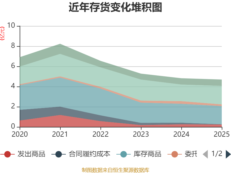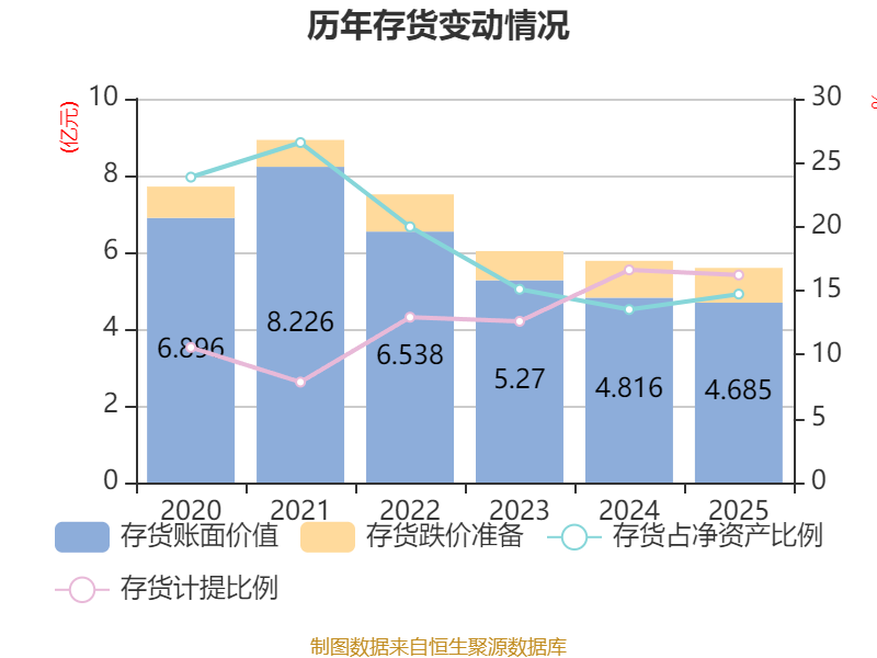 从存货变动来看,截至2025年末,公司存货账面价值为4.68亿元,占净资产的14.73%,较上年末减少1310.99万元。其中,存货跌价准备为9068.59万元,计提比例为16.22%。