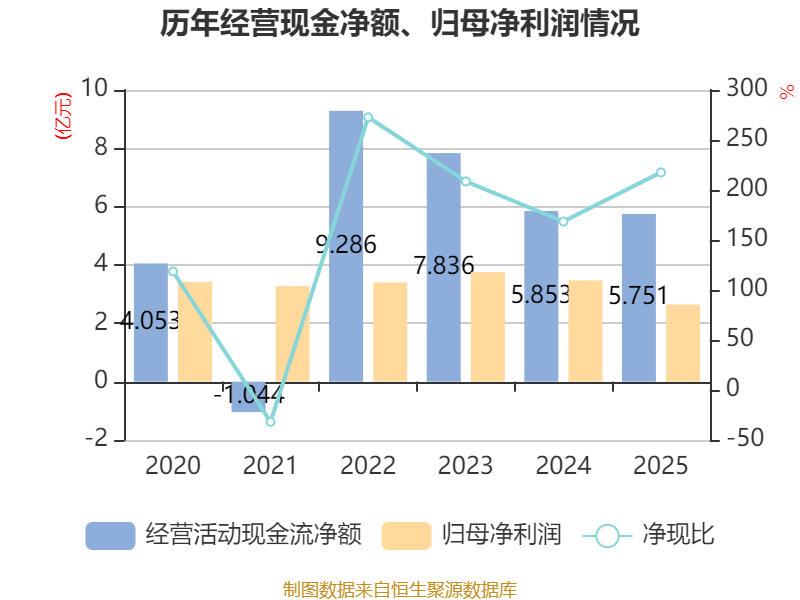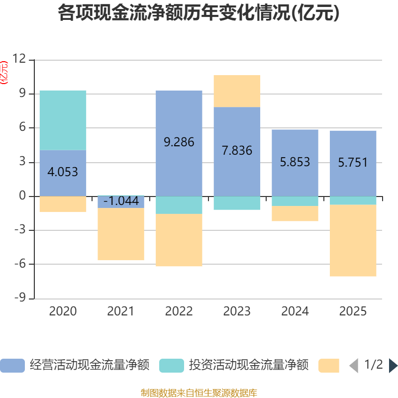 截至2025年,公司经营活动现金流净额为5.75亿元,同比下降1.75%;筹资活动现金流净额-6.3亿元,同比减少4.97亿元;投资活动现金流净额-7586.45万元,上年同期为-8636.07万元。