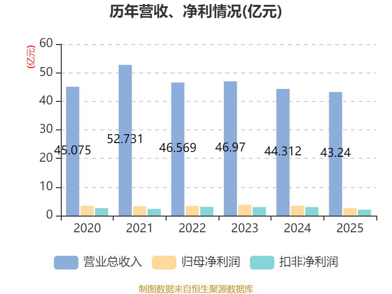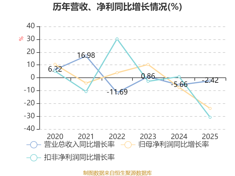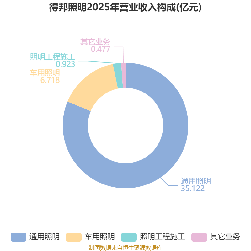 中证智能财讯得邦照明(603303)3月21日披露2025年年度报告。2025年,公司实现营业总收入43.24亿元,同比下降2.42%;归母净利润2.64亿元,同比下降23.90%;扣非净利润2.07亿元,同比下降30.82%;经营活动产生的现金流量净额为5.75亿元,同比下降1.75%;报告期内,得邦照明基本每股收益为0.5651元,加权平均净资产收益率为7.85%。公司2025年度分配预案为:拟向全体股东每10股派现3.1元(含税)。