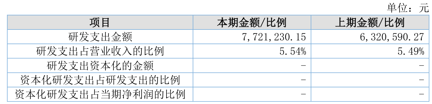 2025年全年,公司研发投入金额为772.12万元,同比增长22.16%;研发投入占营业收入比例为5.54%,相比上年同期上升0.05个百分点。