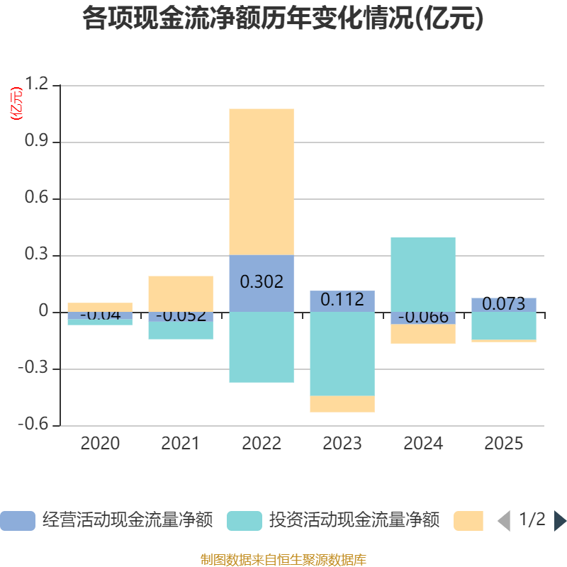 截至2025年,公司经营活动现金流净额为725.45万元,同比增加1384.8万元;筹资活动现金流净额-116.24万元,同比增加898.9万元;投资活动现金流净额-1482.62万元,上年同期为3944.04万元。