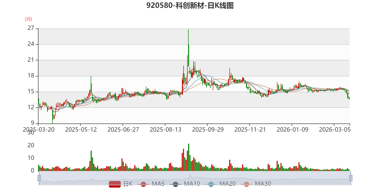 以3月20日收盘价计算,科创新材目前市盈率(TTM)约为66.29倍,市净率(LF)约3.43倍,市销率(TTM)约8.41倍。