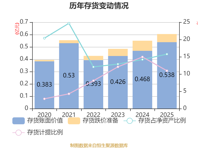 从存货变动来看,截至2025年末,公司存货账面价值为5383.21万元,占净资产的15.75%,较上年末增加699.44万元。其中,存货跌价准备为661.35万元,计提比例为10.94%。