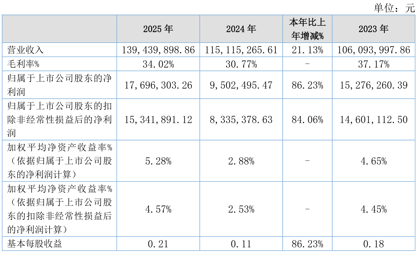中证智能财讯科创新材(920580)3月20日披露2025年年度报告。2025年,公司实现营业总收入1.39亿元,同比增长21.13%;归母净利润1769.63万元,同比增长86.23%;扣非净利润1534.19万元,同比增长84.06%;经营活动产生的现金流量净额为725.45万元,上年同期为-659.35万元;报告期内,科创新材基本每股收益为0.21元,加权平均净资产收益率为5.28%。公司2025年度分配预案为:拟向全体股东每10股派现0.7元(含税)。