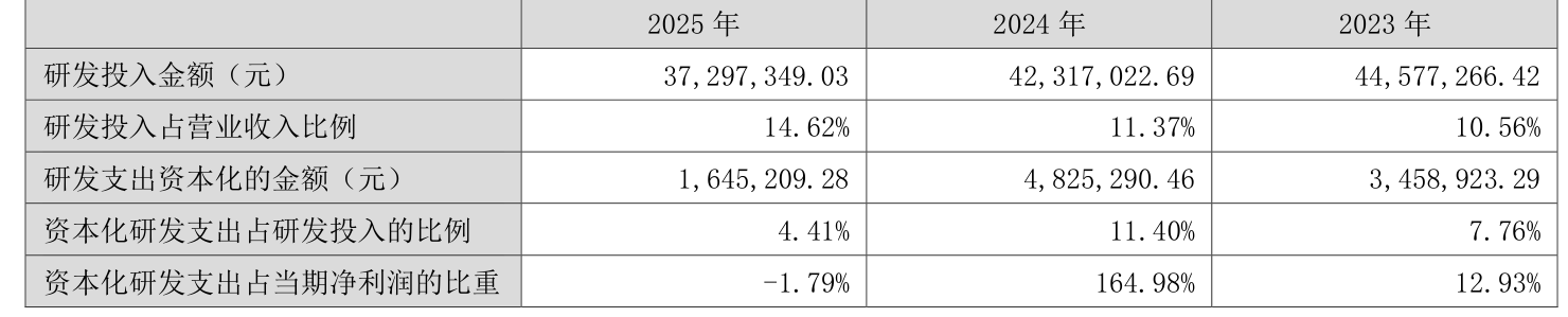 2025年全年,公司研发投入金额为3729.73万元,同比下降11.86%;研发投入占营业收入比例为14.62%,相比上年同期上升3.25个百分点。此外,公司全年研发投入资本化率为4.41%。