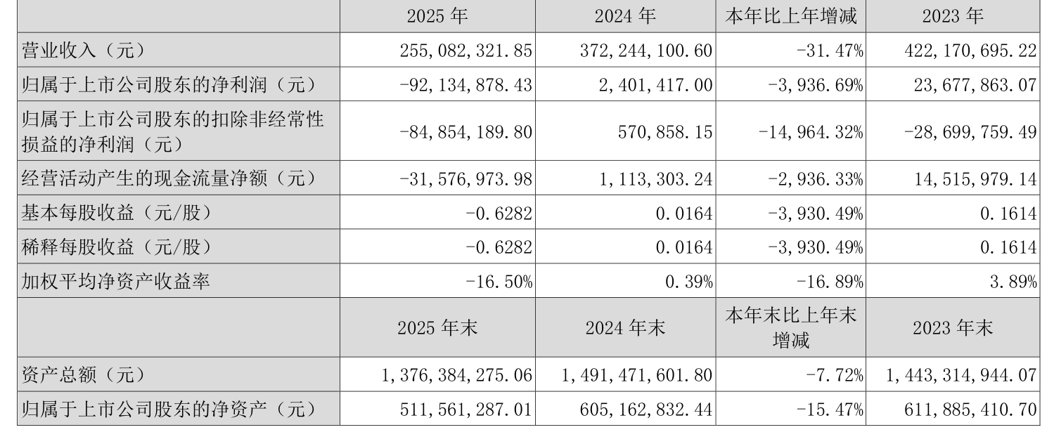 中证智能财讯建科院(300675)3月21日披露2025年年度报告。2025年,公司实现营业总收入2.55亿元,同比下降31.47%;归母净利润亏损9213.49万元,上年同期盈利240.14万元;扣非净利润亏损8485.42万元,上年同期盈利57.09万元;经营活动产生的现金流量净额为-3157.7万元,上年同期为111.33万元;报告期内,建科院基本每股收益为-0.6282元,加权平均净资产收益率为-16.50%。