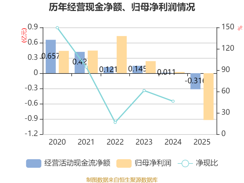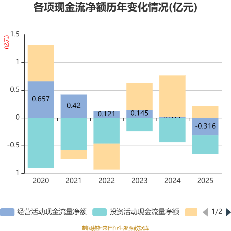 截至2025年,公司经营活动现金流净额为-3157.7万元,同比减少3269.03万元;筹资活动现金流净额2108.65万元,同比减少5419.02万元;投资活动现金流净额-3365.14万元,上年同期为-4432.33万元。