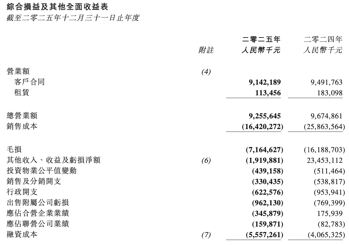 集团毛损为约人民币71.65亿元,较二零二四年之毛损约人民币161.89亿元改善55.7%,毛损率为77.4%。若撇除计入销售成本的可供销售物业减值亏损(包括若干旧改项目亏损),二零二五年,本集团毛利为约人民币6.50亿元,较二零二四年同等口径之毛利人民币6.30亿元上升3.2%,二零二五年毛利率为7.0%(二零二四年:6.5%)。