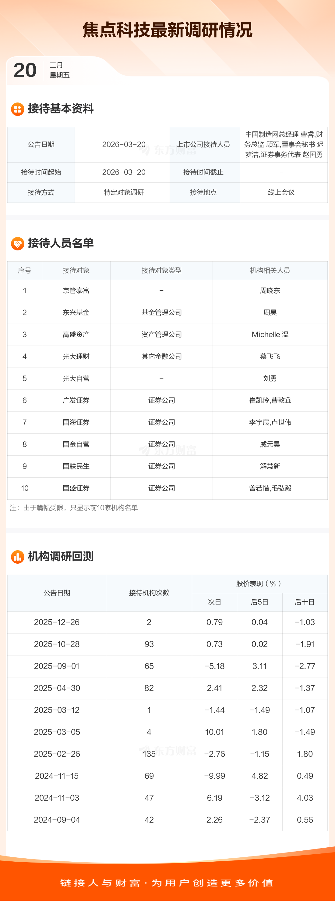 焦点科技3月20日公告称,3月20日接待京管泰富等63家机构调研。接待人员包括中国制造网总经理 曹睿,财务总监 顾军,董事会秘书 迟梦洁,证券事务代表 赵国勇。