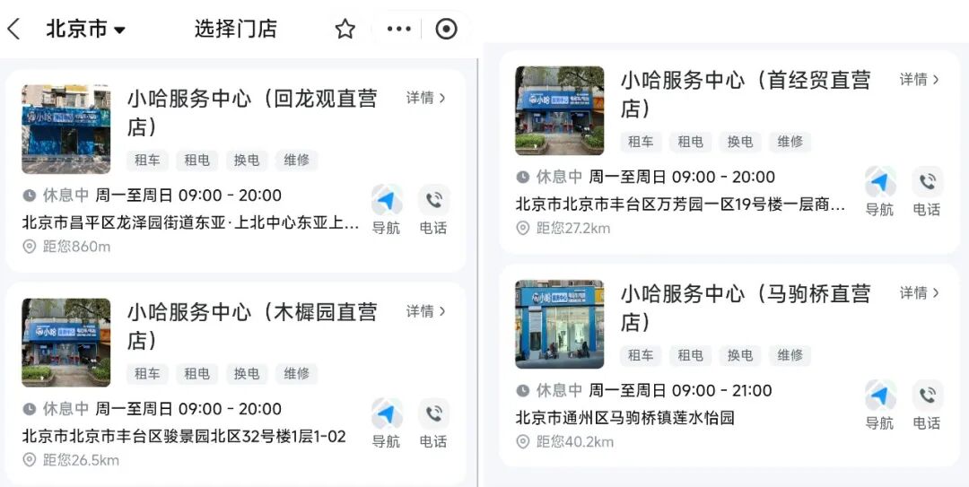 其规模不大,北京全市仅有四家线下门店,在小哈换电小程序上,标注“直营店”字样。