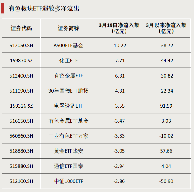 有色金属、化工、黄金等偏周期板块ETF遭遇明显资金净流出。3月19日,单日净流出前十ETF中,此类产品数量居多。截至3月19日,部分产品3月以来资金净流出金额已超过30亿元。