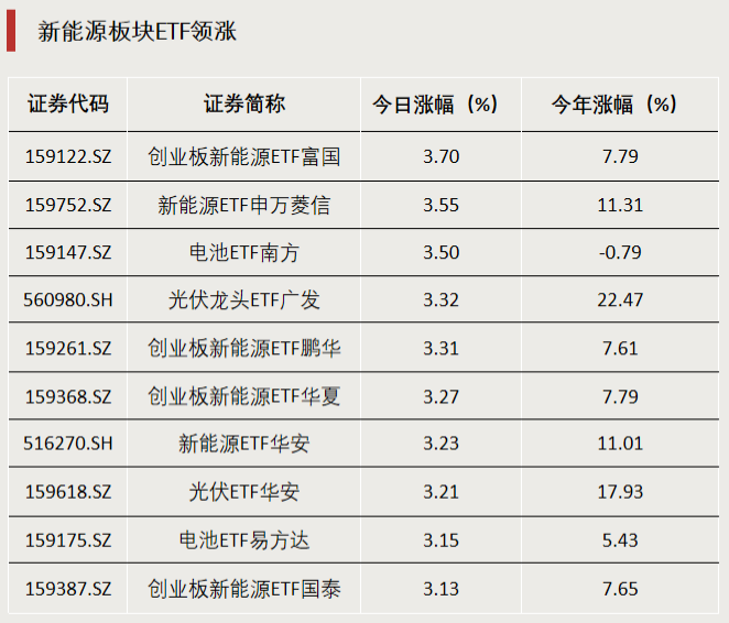 创业板新能源ETF富国以3.7%的涨幅居市场首位,新能源ETF申万菱信、电池ETF南方紧随其后,分别上涨3.55%、3.5%。