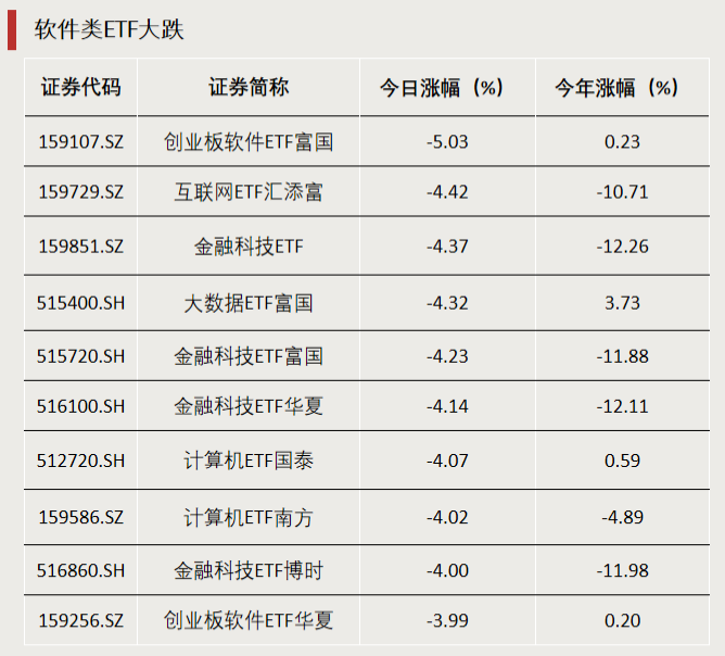 与之形成对比的是,软件、互联网、金融科技、大数据等软件科技类ETF大幅回调,其中9只产品单日跌幅超4%。截至今日收盘,不少相关ETF今年以来跌幅已超10%。