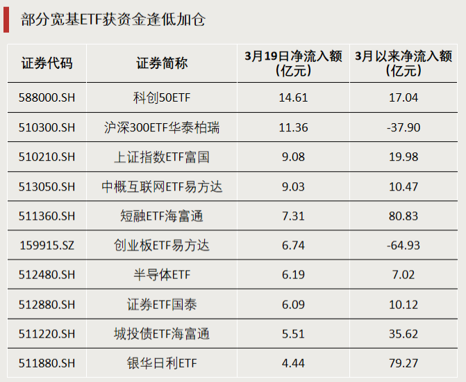 资金流向上,前一交易日(3月19日),在市场回调之际,ETF市场整体获超70亿元资金净流入,一改此前连续三个交易日资金净流出局面。主投科创50、沪深300、上证指数、创业板指数的部分主流宽基ETF获较多资金逆势加仓。