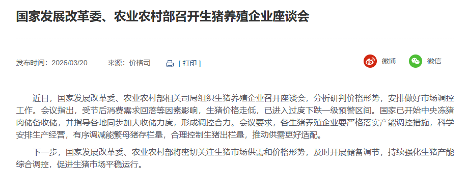 近日,国家发展改革委、农业农村部相关司局组织生猪养殖企业召开座谈会,分析研判价格形势,安排做好市场调控工作。会议指出,受节后消费需求回落等因素影响,生猪价格走低,已进入过度下跌一级预警区间。国家已开始中央冻猪肉储备收储,并指导各地同步加大收储力度,形成调控合力。会议要求,各生猪养殖企业要严格落实产能调控措施,科学安排生产经营,有序调减能繁母猪存栏量,合理控制生猪出栏量,推动供需更好适配。