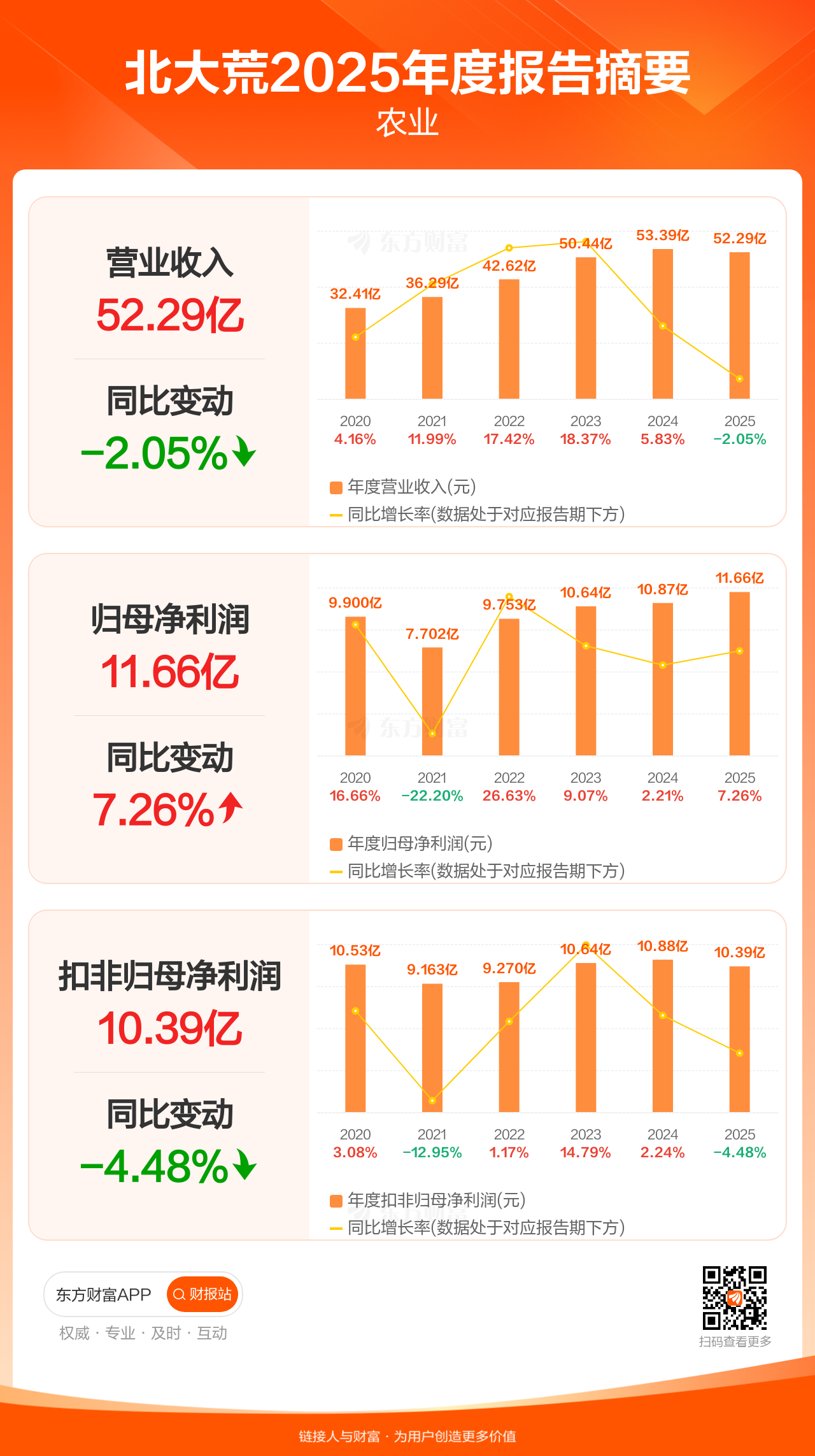 北大荒3月21日发布2025年年报显示,公司全年实现营业收入52.29亿元,同比下滑2.05%;归母净利润11.66亿元,同比增长7.26%;扣非归母净利润10.39亿元,同比下滑4.48%。每股EPS0.66元,低于机构一致预测的0.68元。