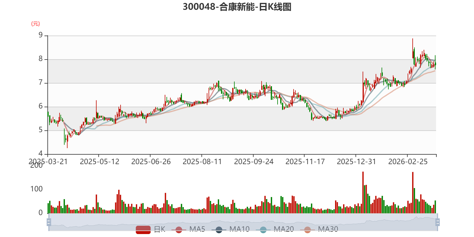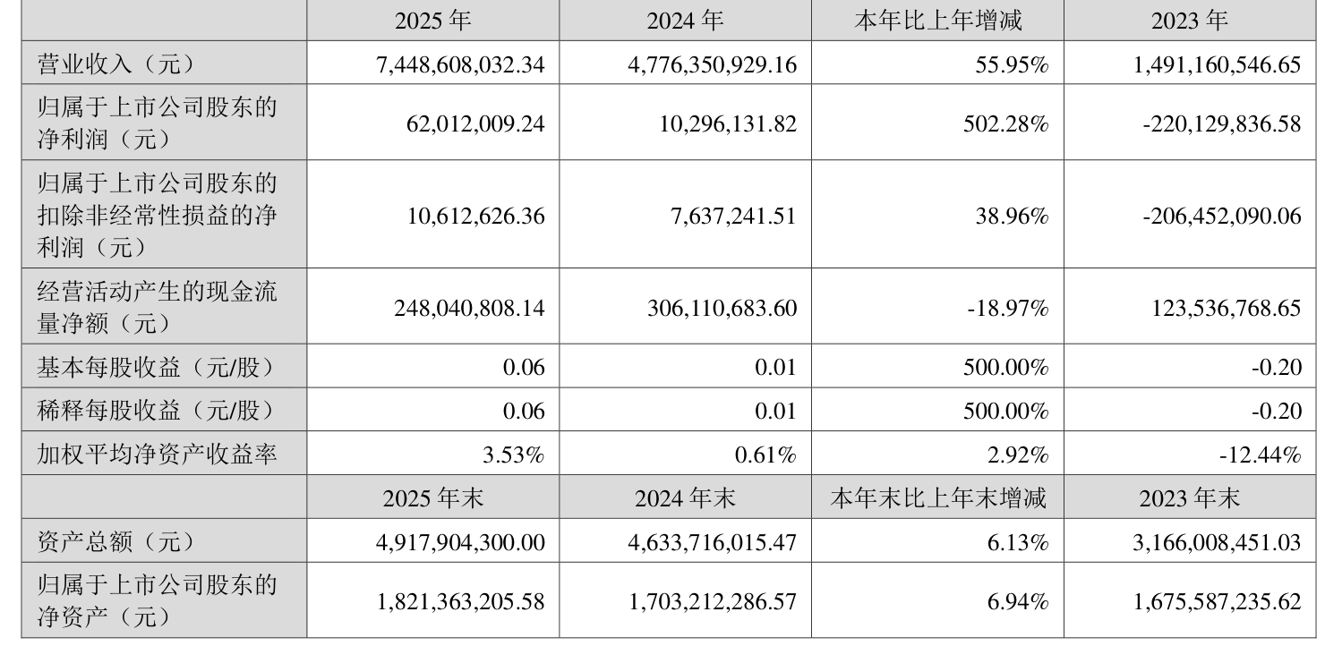 中证智能财讯合康新能(300048)3月21日披露2025年年度报告。2025年,公司实现营业总收入74.49亿元,同比增长55.95%;归母净利润6201.2万元,同比增长502.28%;扣非净利润1061.26万元,同比增长38.96%;经营活动产生的现金流量净额为2.48亿元,同比下降18.97%;报告期内,合康新能基本每股收益为0.06元,加权平均净资产收益率为3.53%。