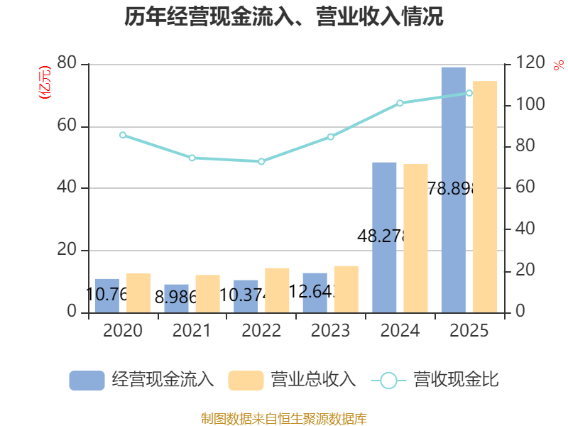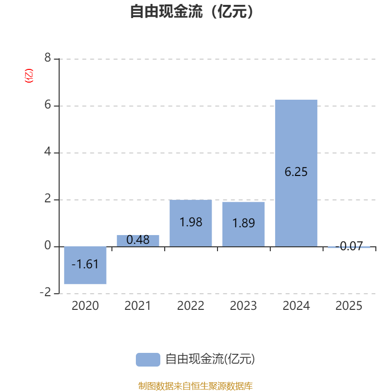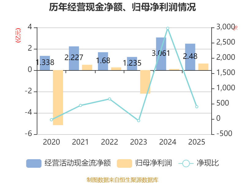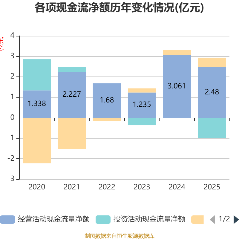 截至2025年,公司经营活动现金流净额为2.48亿元,同比下降18.97%;筹资活动现金流净额4559.56万元,同比增加2269.58万元;投资活动现金流净额-9821.53万元,上年同期为176.21万元。