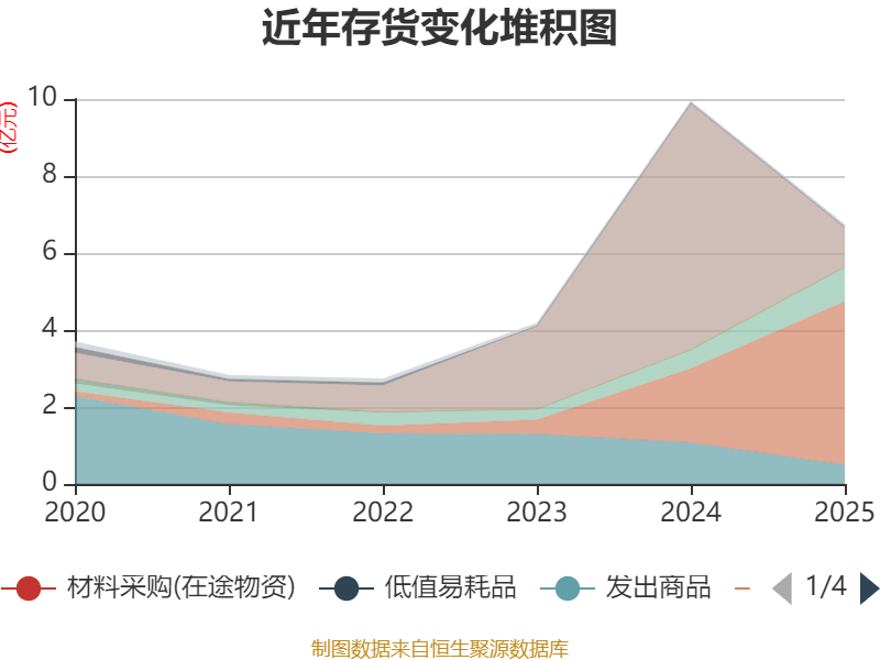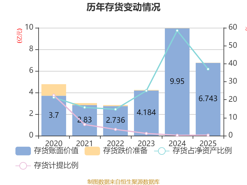 从存货变动来看,截至2025年末,公司存货账面价值为6.74亿元,占净资产的37.02%,较上年末减少3.21亿元。其中,存货跌价准备为200.49万元,计提比例为0.3%。