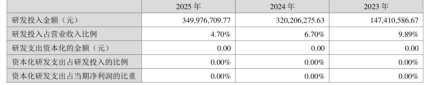2025年全年,公司研发投入金额为3.5亿元,同比增长9.3%;研发投入占营业收入比例为4.7%,相比上年同期下降2个百分点。此外,公司全年研发投入资本化率为0%。