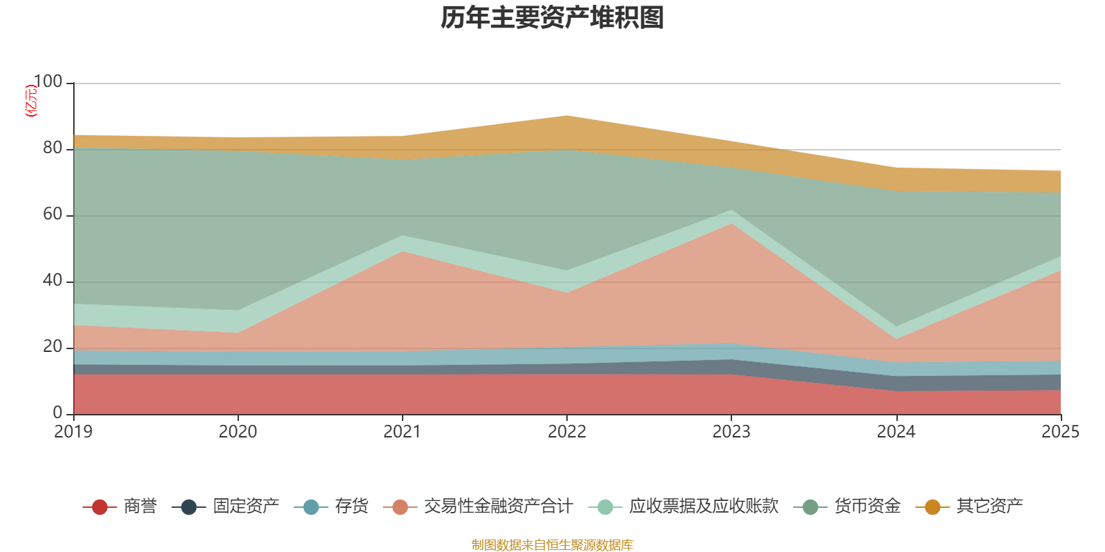 资产重大变化方面,截至2025年末,公司货币资金较上年末减少52.94%,占公司总资产比重下降28.79个百分点;交易性金融资产合计较上年末增加286.66%,占公司总资产比重上升27.71个百分点;长期股权投资较上年末减少52.87%,占公司总资产比重下降0.81个百分点;应收票据及应收账款较上年末增加12.4%,占公司总资产比重上升0.7个百分点。