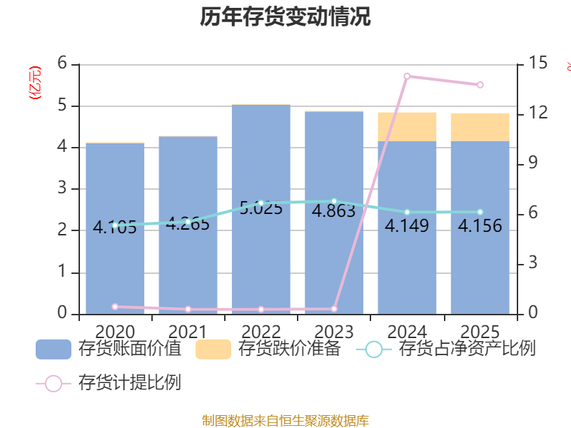 从存货变动来看,截至2025年末,公司存货账面价值为4.16亿元,占净资产的6.12%,较上年末增加72.33万元。其中,存货跌价准备为6630.3万元,计提比例为13.76%。
