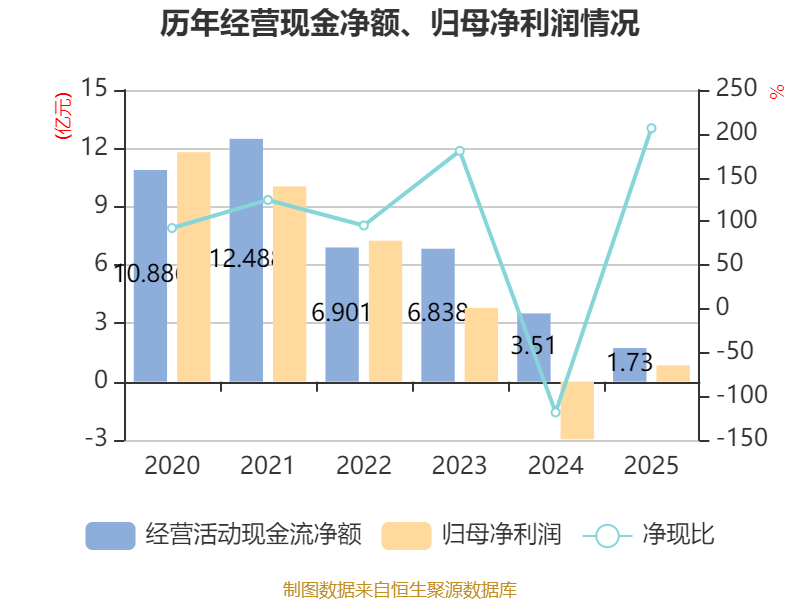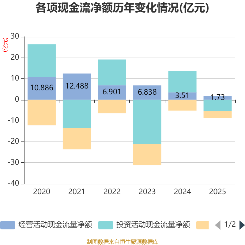 截至2025年,公司经营活动现金流净额为1.73亿元,同比下降50.72%;筹资活动现金流净额-3.38亿元,同比增加1.78亿元;投资活动现金流净额-5.29亿元,上年同期为10.15亿元。