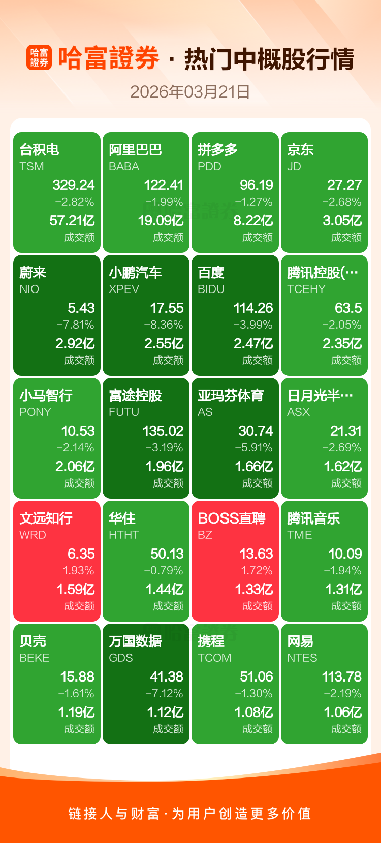 台积电跌2.82%,阿里巴巴跌1.99%,拼多多跌1.27%,京东跌2.68%,蔚来跌7.81%,小鹏汽车跌8.36%,百度跌3.99%,腾讯控股(ADR)跌2.05%,小马智行跌2.14%,富途控股跌3.19%。