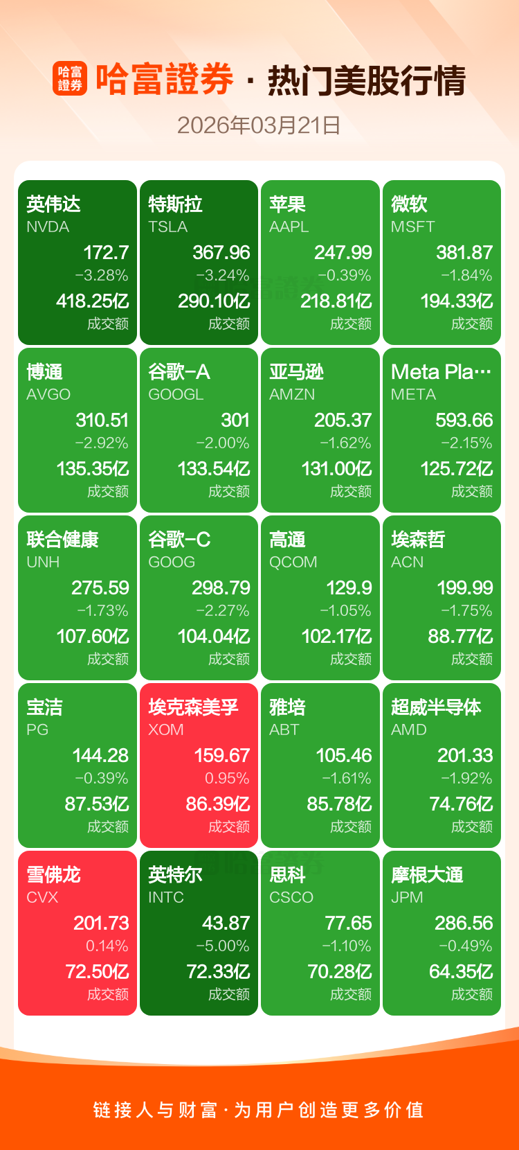 英伟达跌3.28%,特斯拉跌3.24%,苹果跌0.39%,微软跌1.84%,博通跌2.92%,谷歌-A跌2.00%,亚马逊跌1.62%,Meta Platforms Inc-A跌2.15%,联合健康跌1.73%,谷歌-C跌2.27%。