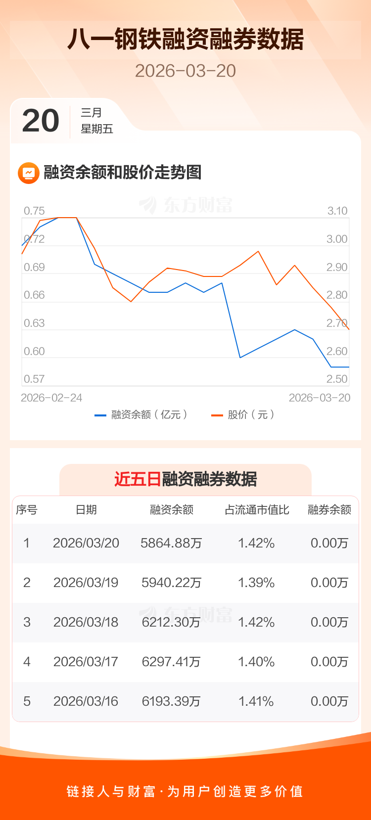 交易所最新数据显示,八一钢铁于2026年3月20日获融资买入38.23万元,融资偿还113.56万元,当日融资净偿还75.33万元。目前,该股融资余额5864.88万,占流通市值比例为1.42%。