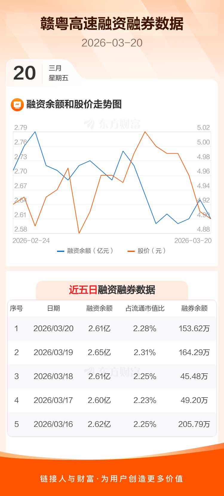交易所最新数据显示,赣粤高速于2026年3月20日获融资买入677.75万元,融资偿还1063.04万元,当日融资净偿还385.29万元。目前,该股融资余额2.61亿,占流通市值比例为2.28%。