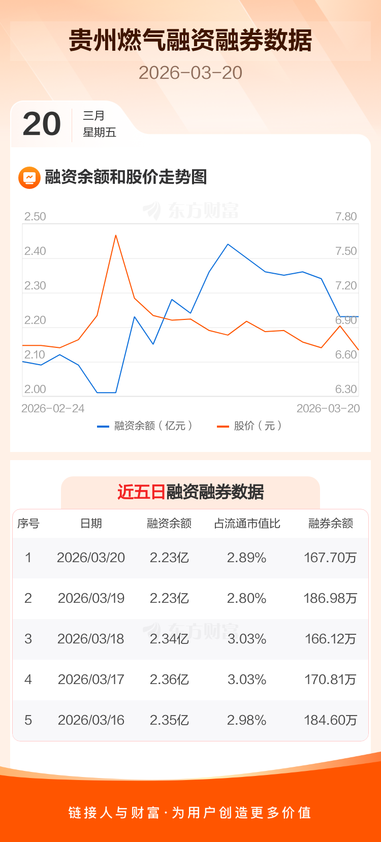 交易所最新数据显示,贵州燃气于2026年3月20日获融资买入2196.64万元,融资偿还2174.23万元,当日融资净买入22.4万元。目前,该股融资余额2.23亿,占流通市值比例为2.89%。