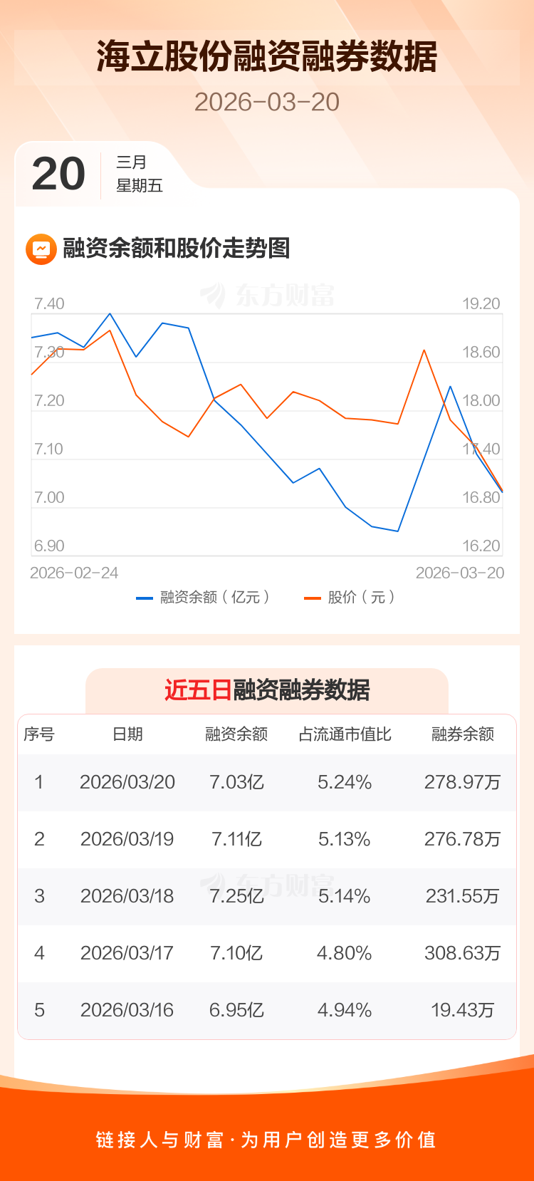 交易所最新数据显示,海立股份于2026年3月20日获融资买入3355.41万元,融资偿还4108.87万元,当日融资净偿还753.45万元。目前,该股融资余额7.03亿,占流通市值比例为5.24%。