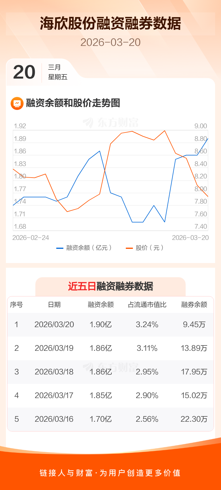 交易所最新数据显示,海欣股份于2026年3月20日获融资买入1153.10万元,融资偿还809.93万元,当日融资净买入343.17万元。目前,该股融资余额1.90亿,占流通市值比例为3.24%。