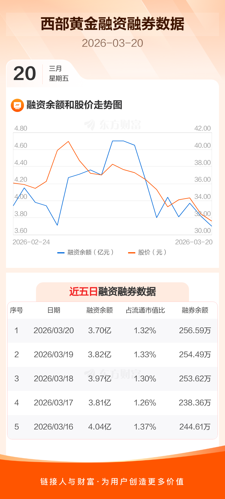交易所最新数据显示,西部黄金于2026年3月20日获融资买入1914.68万元,融资偿还3135.53万元,当日融资净偿还1220.85万元。目前,该股融资余额3.70亿,占流通市值比例为1.32%。