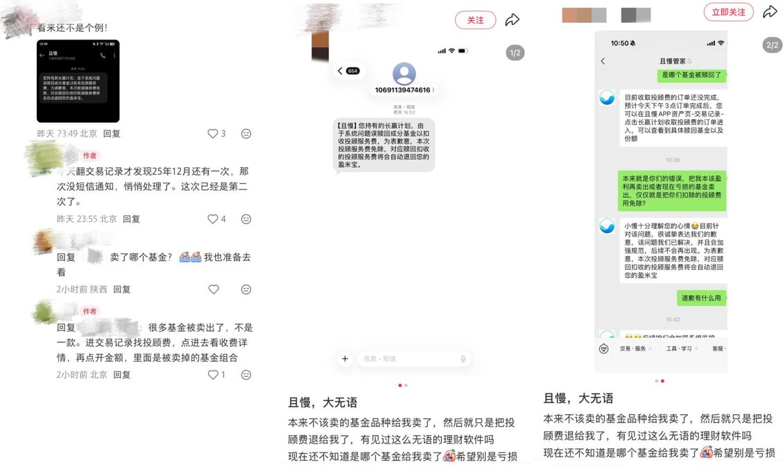 该用户发布的内容显示,其持有的“长赢计划”,因且慢平台收取投顾费时误触发“通过赎回成分基金方式收取”,导致组合中的基金被赎回。用户指出“收费我都认了,关键他随随便便就把我的基金给卖了,细思极恐”,“仅仅就是把他们扣的手续费退给我,那我被卖掉的基金损失谁来管啊”。