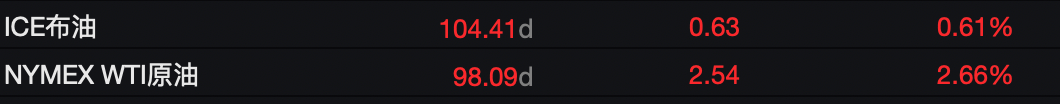 国际油价方面,截至最新收盘,ICE布油报104.41美元/桶,NYMEX WTI原油报98.09美元/桶。