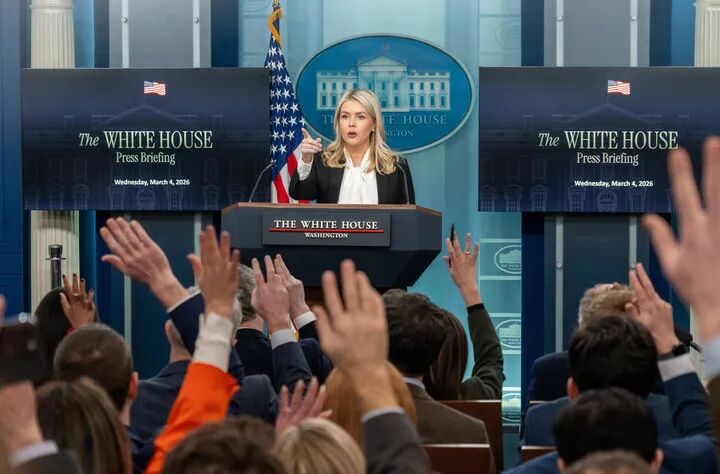 3月4日,在美国首都华盛顿,白宫新闻秘书莱维特出席记者会。新华社发(李源清摄)