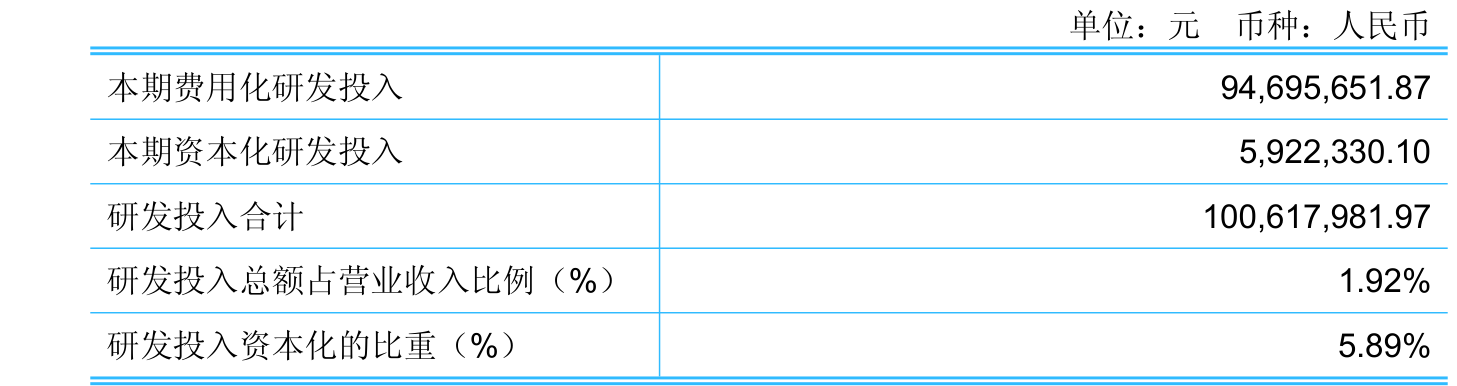 2025年全年,公司研发投入金额为1.01亿元,同比增长6.04%;研发投入占营业收入比例为1.92%,相比上年同期上升0.14个百分点。此外,公司全年研发投入资本化率为5.89%。