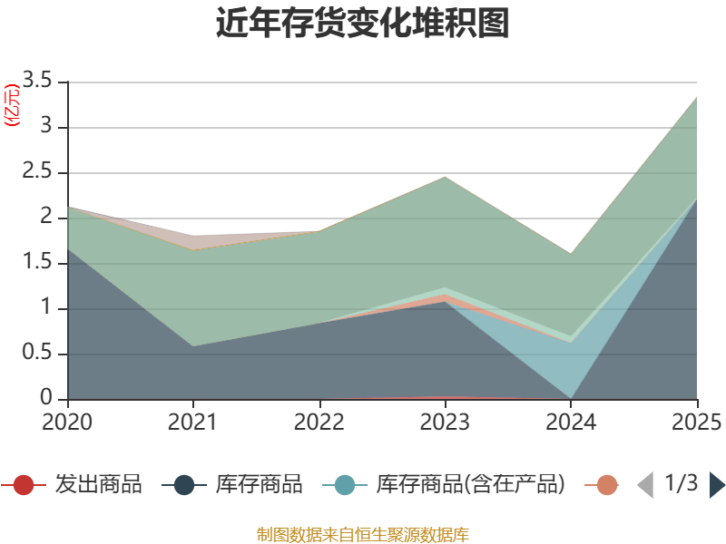 从存货变动来看,截至2025年末,公司存货账面价值为3.33亿元,占净资产的4.16%,较上年末增加1.73亿元。其中,存货跌价准备为2748.97万元,计提比例为7.63%。