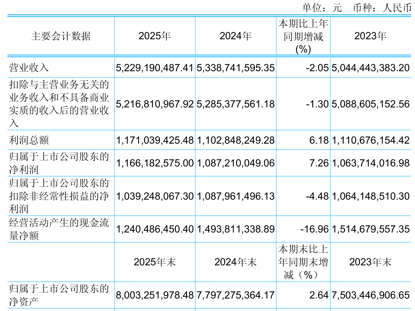 中证智能财讯北大荒(600598)3月21日披露2025年年度报告。2025年,公司实现营业总收入52.29亿元,同比下降2.05%;归母净利润11.66亿元,同比增长7.26%;扣非净利润10.39亿元,同比下降4.48%;经营活动产生的现金流量净额为12.4亿元,同比下降16.96%;报告期内,北大荒基本每股收益为0.656元,加权平均净资产收益率为14.90%。公司2025年度分配预案为:拟向全体股东每10股派现5.5元(含税)。