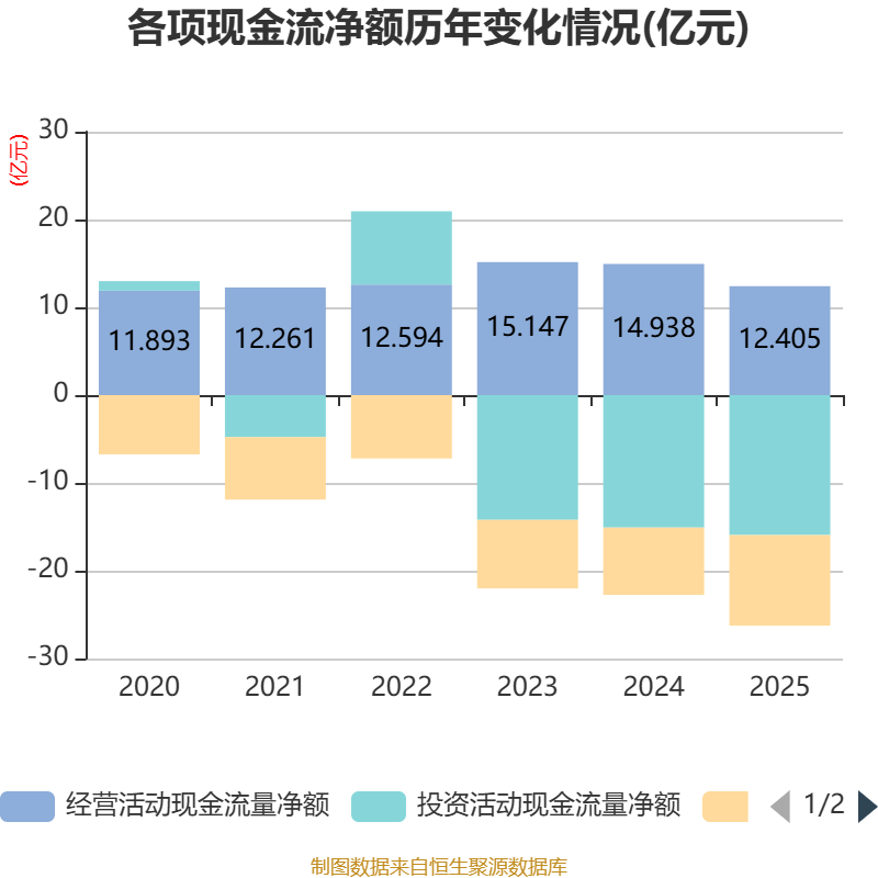 截至2025年,公司经营活动现金流净额为12.4亿元,同比下降16.96%;筹资活动现金流净额-10.32亿元,同比减少2.65亿元;投资活动现金流净额-15.94亿元,上年同期为-15.09亿元。