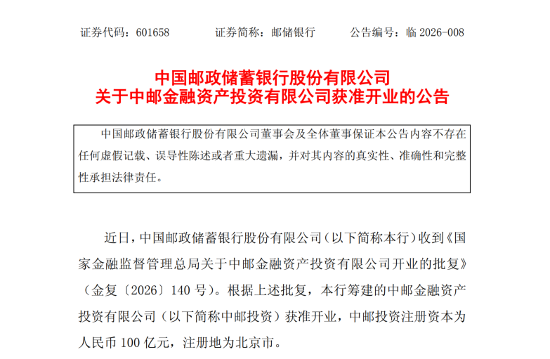 2025年7月,邮储银行发布公告称,拟以自有资金出资100亿元,作为投资主体根据《金融资产投资公司管理办法(试行)》发起设立中邮金融资产投资有限公司。