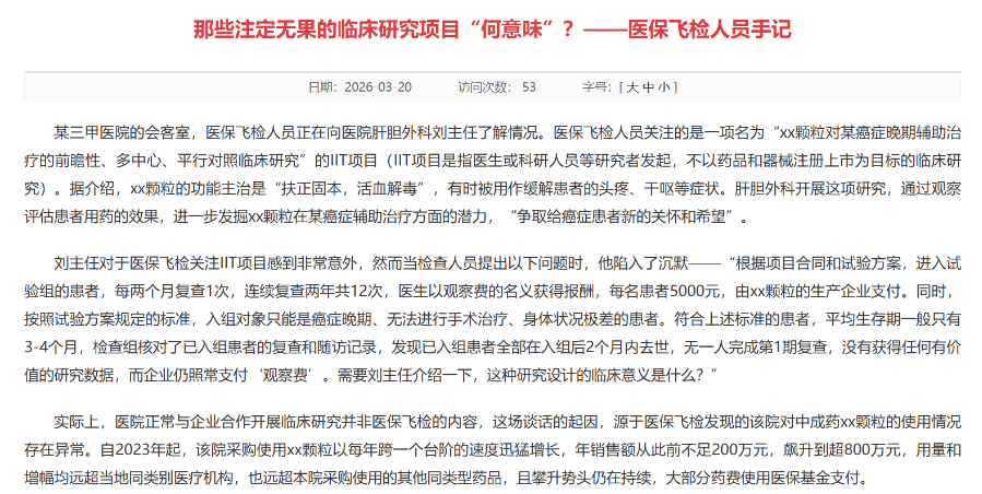 3月20日,国家医保局发布题为《那些注定无果的临床研究项目“何意味”?——医保飞检人员手记》的文章,直指一项由研究者发起的临床研究(IIT)存在明显异常:项目入组对象均为生存期仅3—4个月的晚期癌症患者,却被设计长达两年的随访周期,由相关企业支付高额观察费,最终未形成有效研究数据,相关费用仍被全额结算。