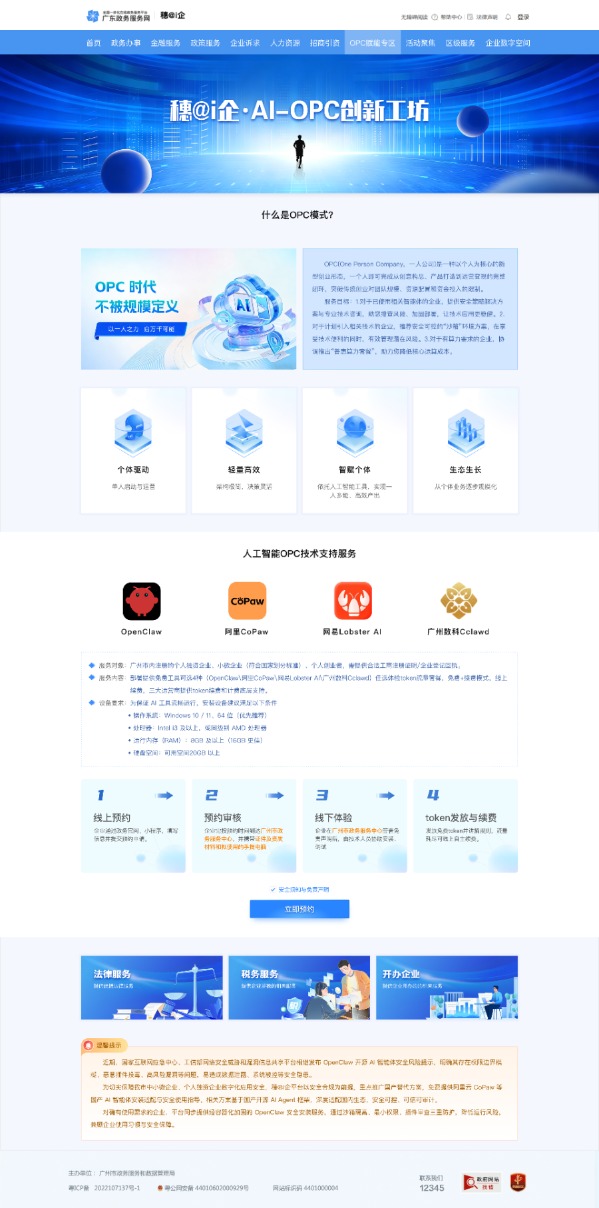 当前,人工智能技术深度渗透经济社会发展各领域,以OPC为特征的新型智能经济形态加速涌现。为助力广东人工智能OPC发展高地,广州近期依托“穗@i企”平台正式上线“人工智能OPC创新工坊”。