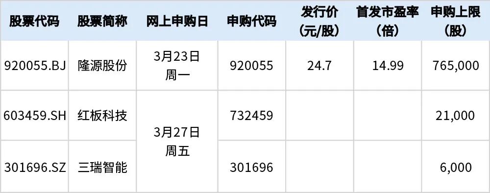 据目前安排,若无变化,下周(3月23日至27日)有3只新股可申购,分别为创业板1只、沪市主板1只和北交所1只。