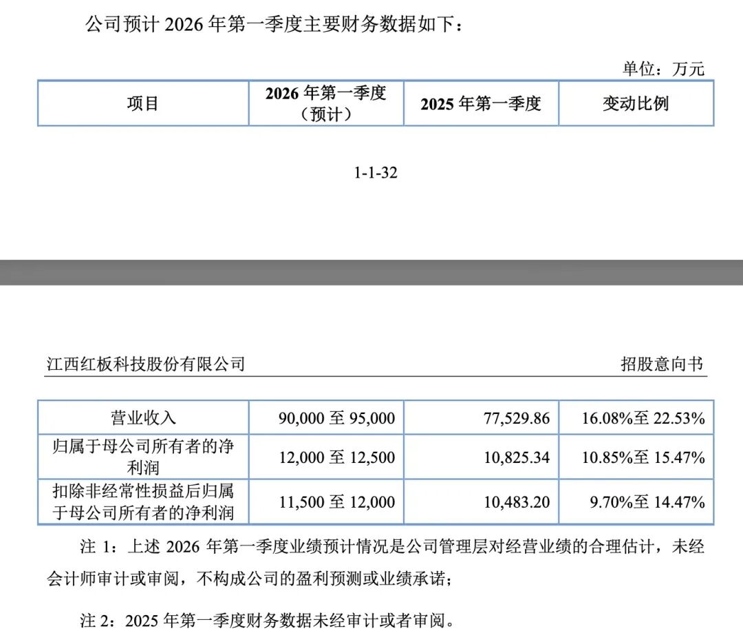 红板科技招股书称,预计公司2026年第一季度实现归属于母公司所有者的净利润1.20亿元至1.25亿元,同比增长10.85%至15.47%。
